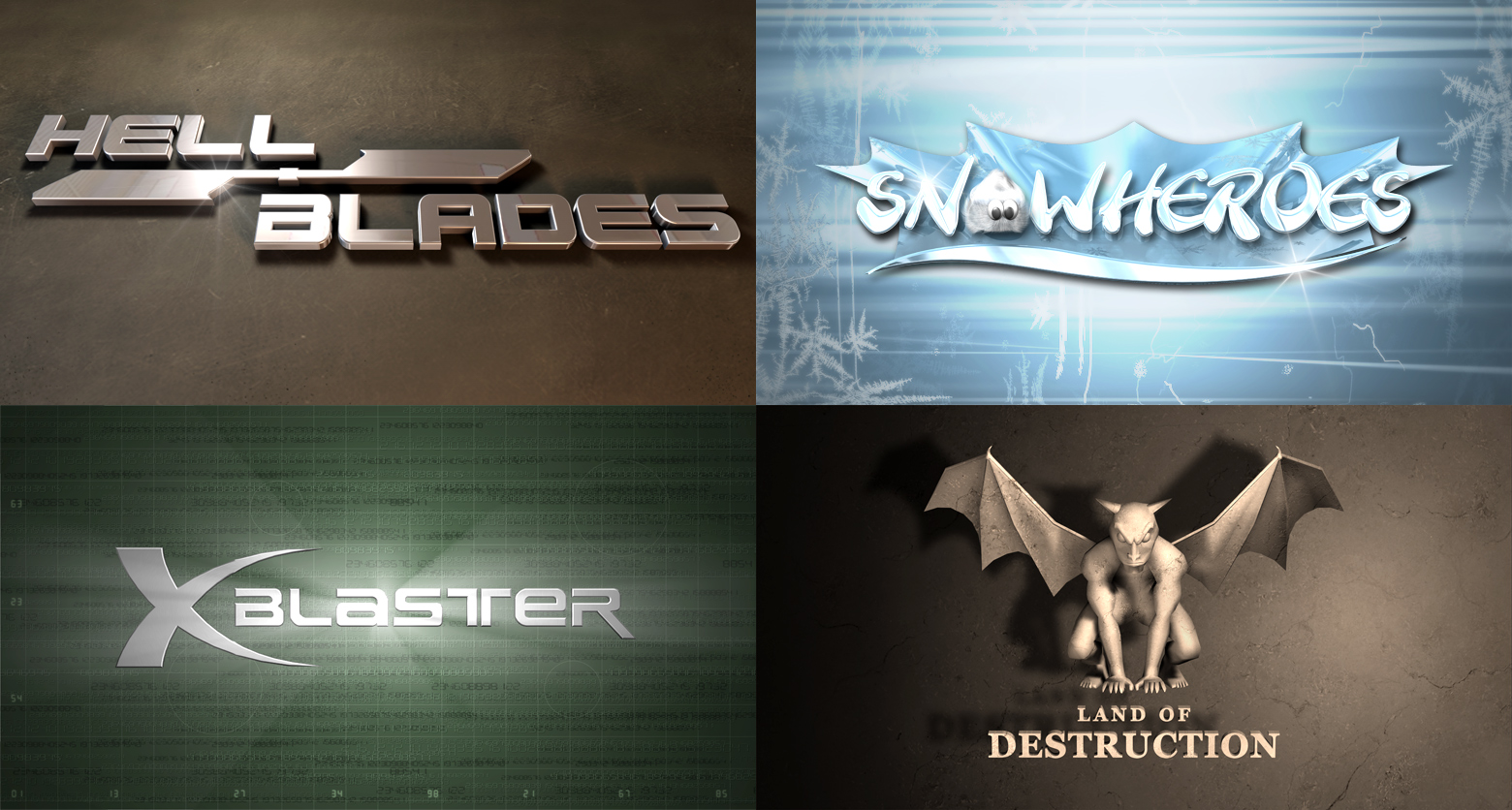 3D-Visualisierungen verschiedener Logos diverser Onlinespiele: HellBlades, Snowheroes, XBlaster und Land of Destruction.