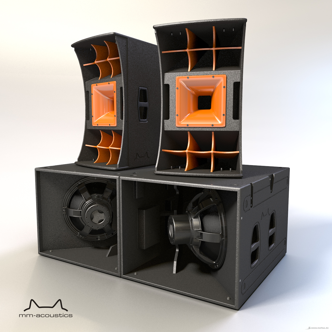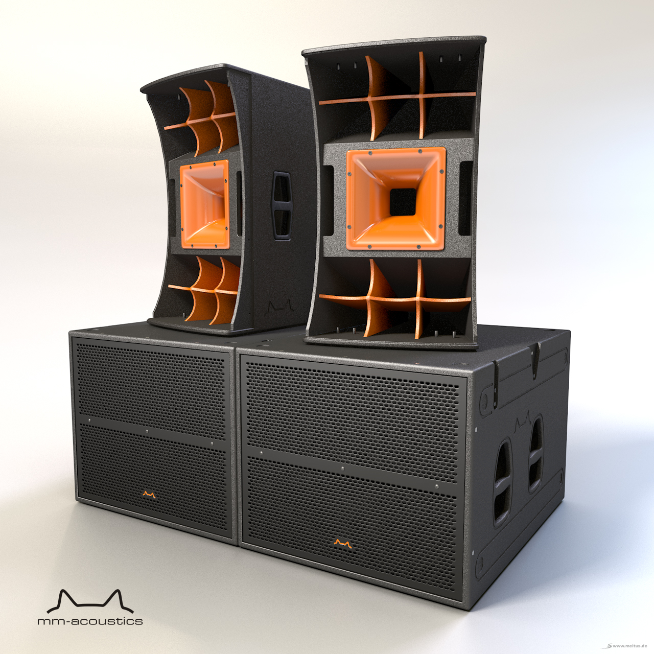 3D Visualisierungen eines MM Acoustics Soundsystems bestehend aus dem Axios One und dem M4.18.
