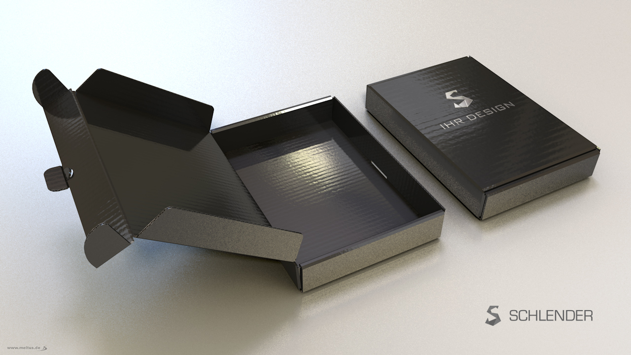 3D Produktvisualisierung: Stabile Wellpappverpackung mit Hochglanzdruck - 3D Produktvisualisierung verschiedener Verpackungen und Officeprodukten wie Ringordner für die Schlender GmbH & Co. KG.