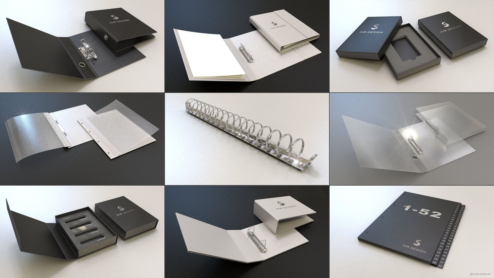 3D Produktvisualisierung verschiedener Verpackungen und Officeprodukten wie Ringordner für die Schlender GmbH & Co. KG.