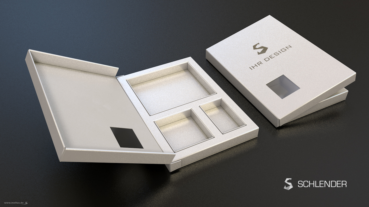 3D Produktvisualisierung: Klappschachtel - 3D Produktvisualisierung verschiedener Verpackungen und Officeprodukten wie Ringordner für die Schlender GmbH & Co. KG.